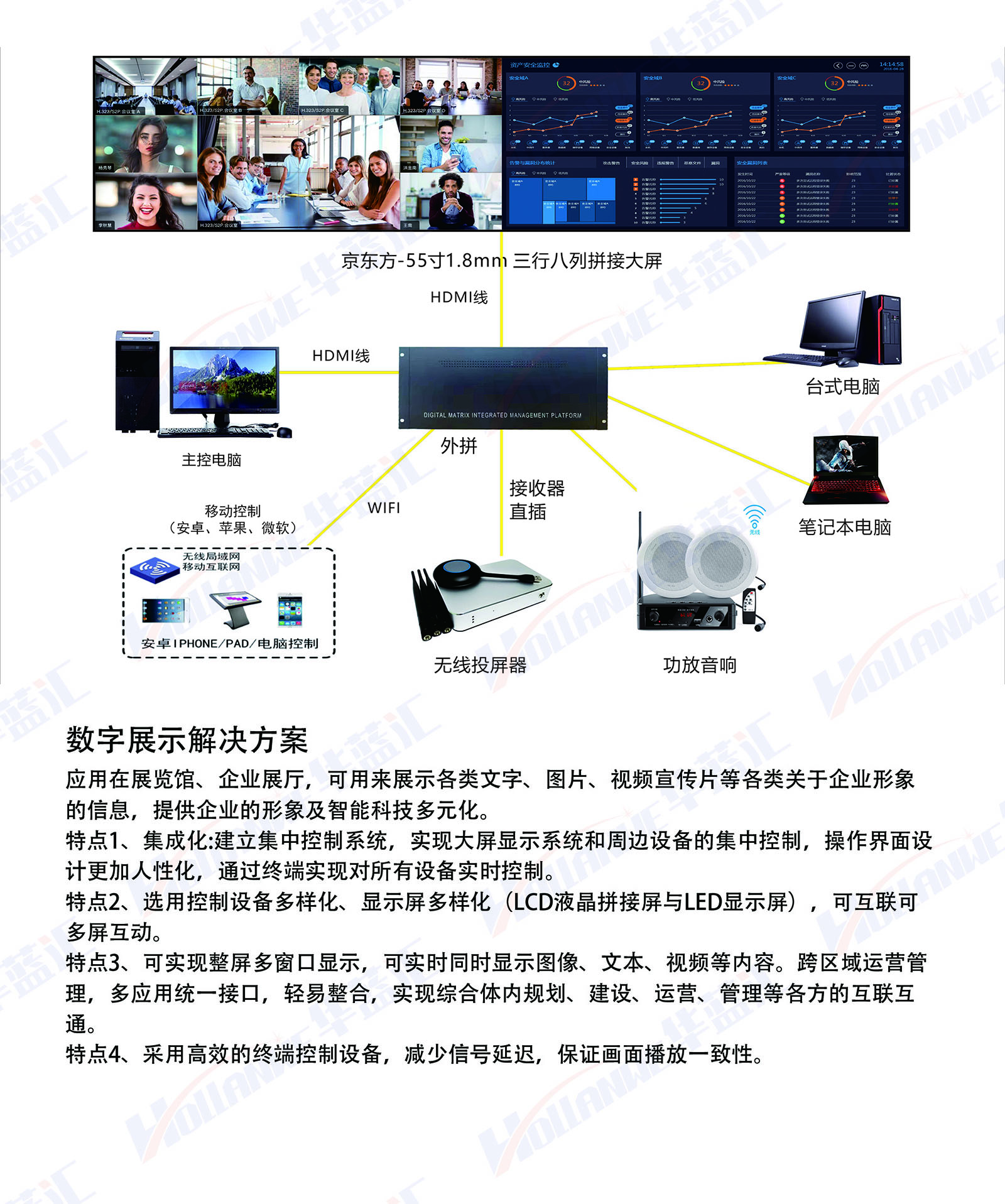 特點3、可實現(xiàn)整屏多窗口顯示,可實時同時顯示圖像、文本、視頻等內(nèi)容。跨區(qū)域運營管理,多應(yīng)用統(tǒng)一接口,輕易整合,實現(xiàn)綜合體內(nèi)規(guī)劃、建設(shè)、運營、管理等各方的互聯(lián)互">